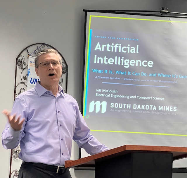 On Feb. 24, Dr. Jeffrey McGough, head of the departments of electrical engineering and computer science at South Dakota Mines, gave Rushmore Rotarians some insight into the current state of AI and what we can expect in the future. He expects AI to continue to play a major role in our healthcare system, improving diagnoses and leading to better treatments. It will also be pivotal in the future of education. At the same time, McGough says the United States will need to prepare for the growing energy needs of AI which will require data centers.